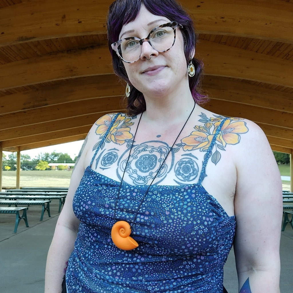 ARK's Seashell Chew Necklace - a robust chewelry option for anyone who needs to chew. Fans of the beach, mermaids, the ocean, and more will love this nautilus-themed design. Because of the spiral shape, this seashell chew pendant gets thicker as it spirals out, giving you the option to chew on different thicknesses.