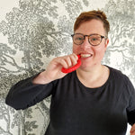 Use it as a safe alternative to chewing on one's hands, shirts, pencils, etc. It can also be used as an oral motor therapy tool to practice biting/chewing skills without the risk of choking, build jaw strength and stability, and exercise the mouth muscles.