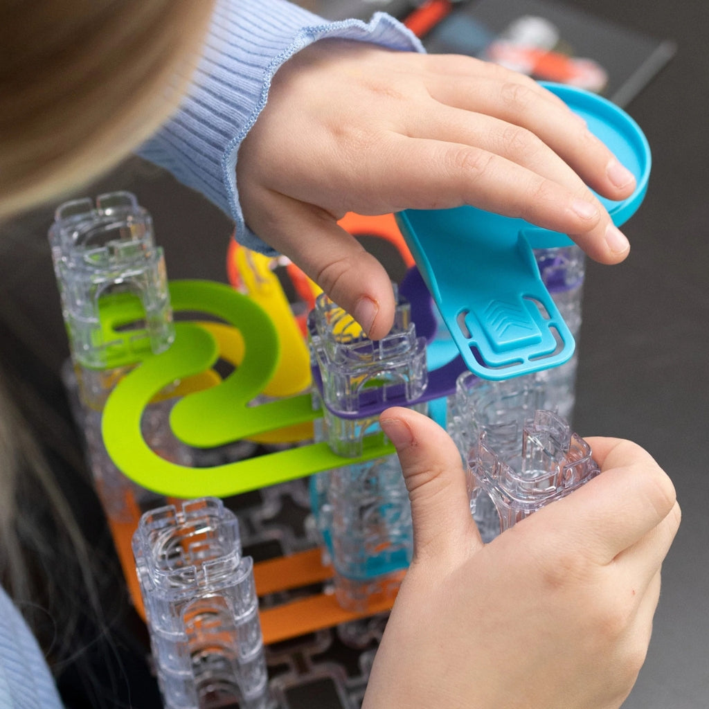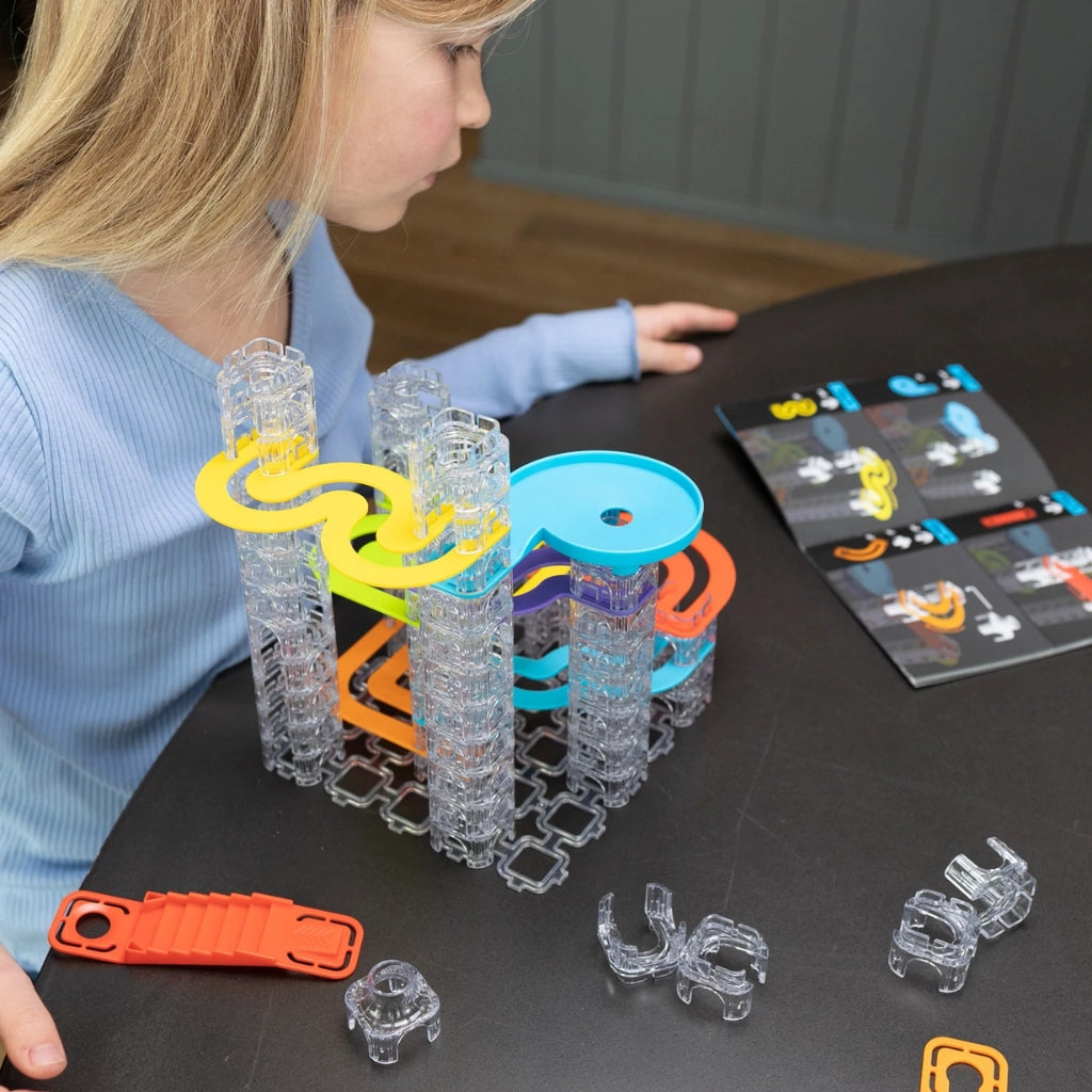 With 124 pieces, the Deluxe Set includes everything needed to construct large, dynamic marble runs. The uniquely designed tracks feature grooves that widen ever so slightly, creating an invisible slope to propel marbles forward in slow motion. It’s a mesmerizing way to introduce concepts like gravity, balance, and cause-and-effect.