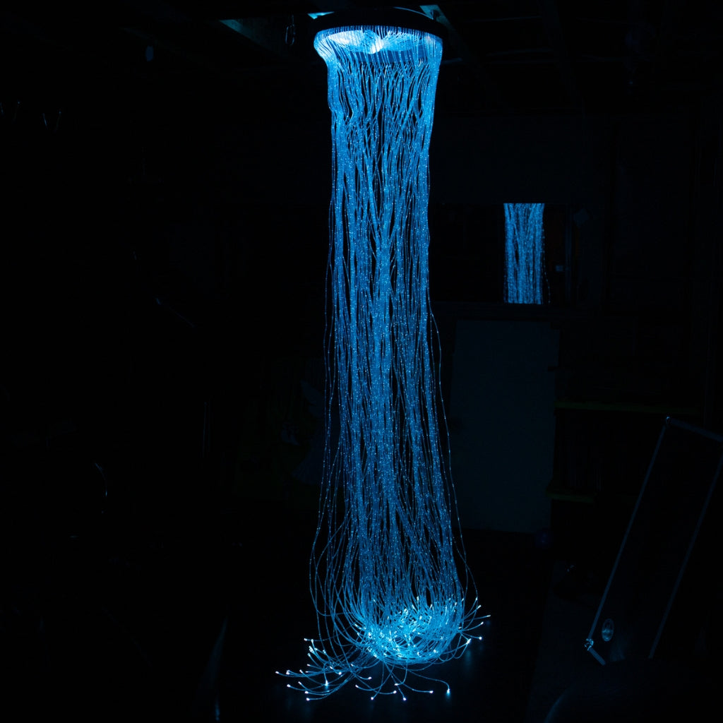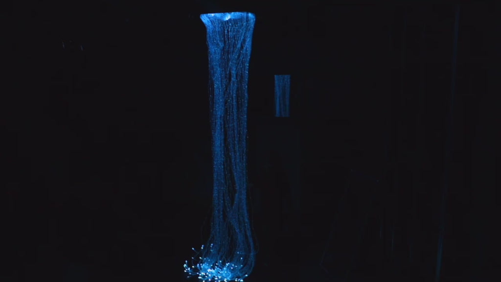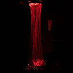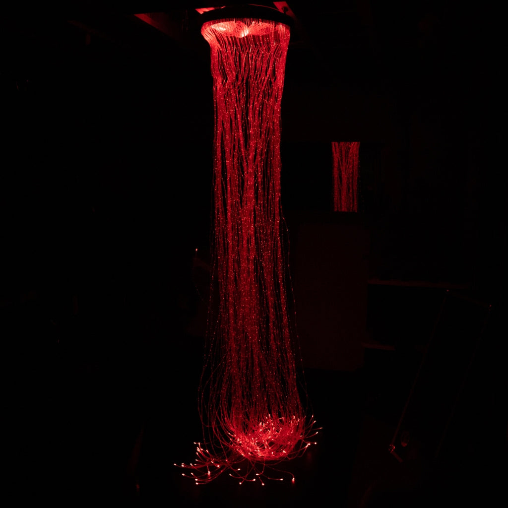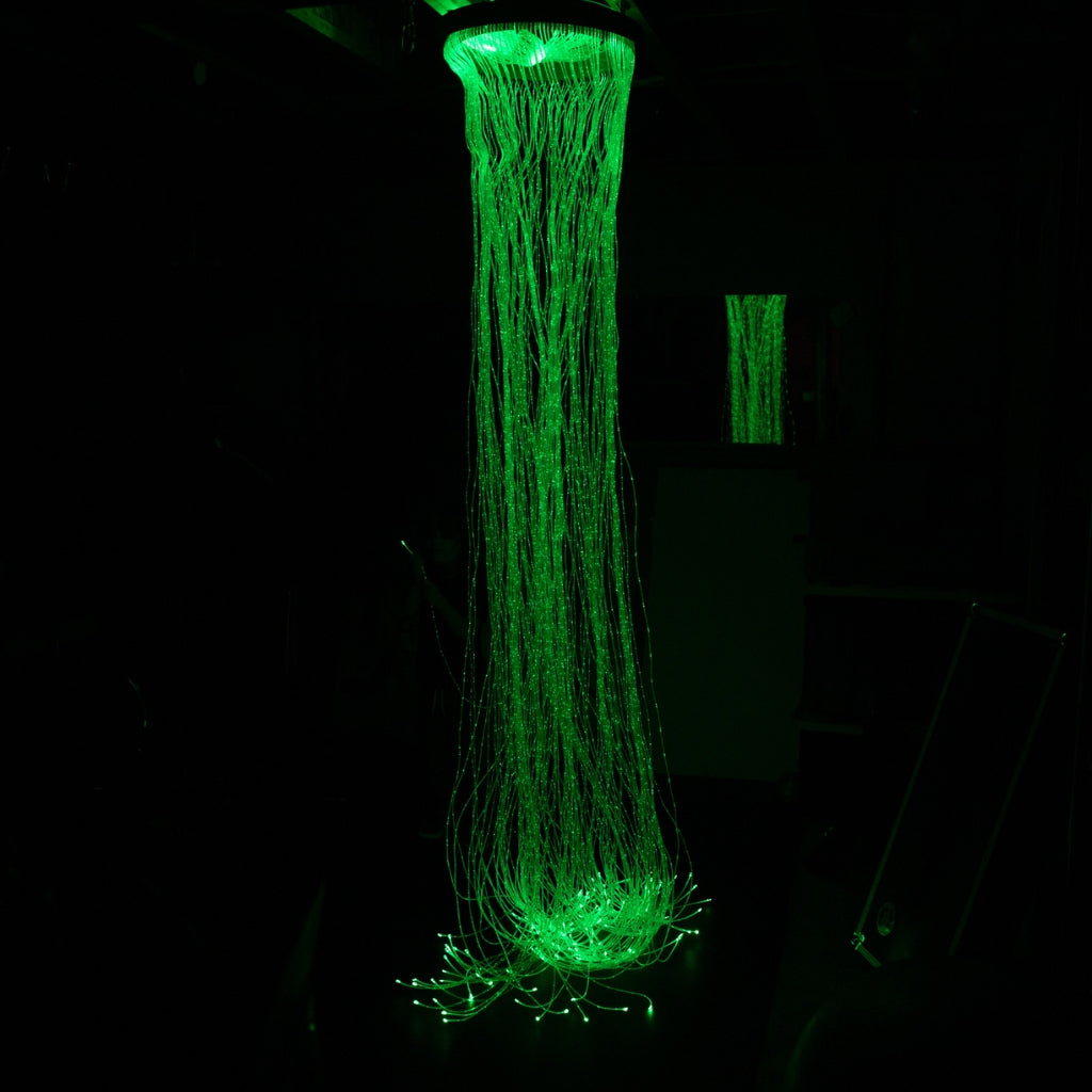This chandelier features 150 soft, glowing fibre optic strands flowing downward from a clean, circular ceiling mount measuring approximately 20 inches (50.8 cm) in diameter. Each strand is 8 feet long (96 inches / 244 cm), creating a soothing waterfall effect that encourages visual tracking and quiet interaction — ideal for sensory rooms and calming spaces.