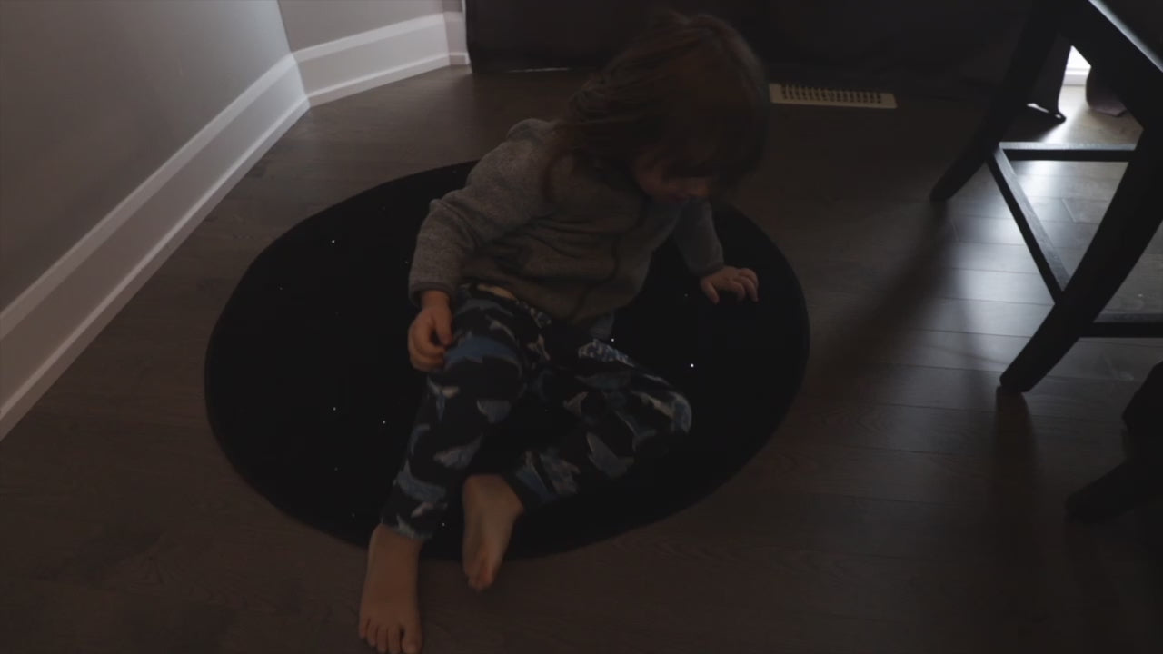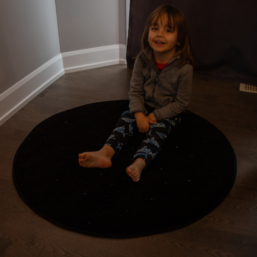 Measuring 37 inches (94 cm) in diameter, this round sensory carpet features a soft carpeted surface with integrated fibre optic points that softly illuminate when pressure is applied. As someone walks, stands, or sits on the carpet, the lights automatically activate and gently fade between red, white, green, and blue, offering a soothing and visually engaging effect without being overwhelming.