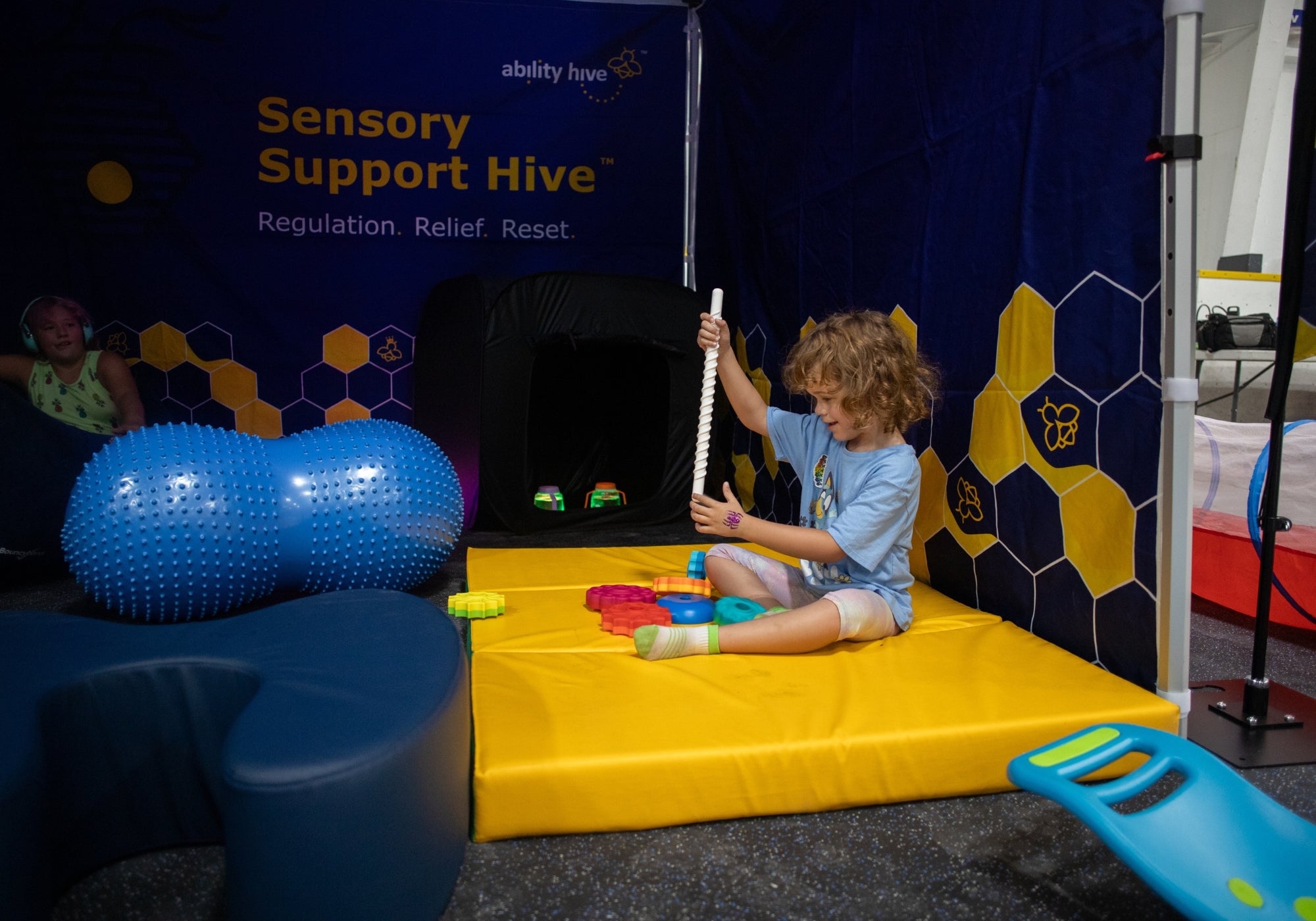 Our mobile sensory room (Sensory Support Hive) rental includes everything needed to create a safe, engaging, and calming environment. This includes soft flooring tiles, sensory lighting, interactive sensory tools, seating, and calming elements. Delivery, setup, and takedown are also included.